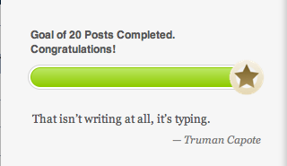 But this response took the wind out of my sails a bit. I’d been mostly ignoring the ‘goal’ messages because I schedule my posts for publication, rather than hitting publish immediately, and this means that I haven’t seen one for a while. I happened to hit the update and got this – my initial thought of “wow, 20 posts, I’m sticking to my plan” was a nice bit of positive reinforcement.