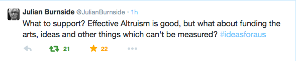 The barrister and #HumanRightsExtremist, Julian Burnside AO QC, was part of today’s Carnegie Conversations at the Opera House. While I’m not there, I was intrigued by a tweet he sent about other discussions going on today regarding the investment of our resources to do the maximum good. (I believe that this was the session following his, with Peter Singer and chaired by Ann Cherry.)